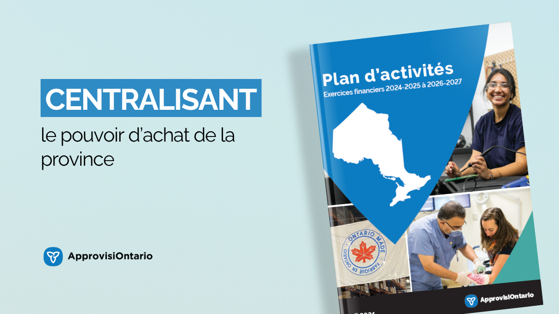 Chez ApprovisiOntario, nous croyons que la modernisation de l’approvisionnement constitue un facteur déterminant de la réussite du secteur public de l’Ontario. Notre mandat consiste à renforcer la gestion de la chaîne d’approvisionnement et l’approvisionnement dans l’ensemble du secteur public, garantissant ainsi que les ministères, organismes provinciaux, hôpitaux, conseils scolaires, sociétés d’aide à l’enfance et autres de l’Ontario ont accès à des produits de grande qualité, opportuns et fiables à une valeur optimale.